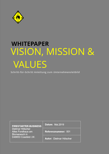 Whitepaper: Vision, Mission & ValuesDownloads, WhitepaperWHITEPAPERVision, Mission & ValuesRUnternehmensleitbildAnleitung zur Erstellung eines Unternehmensleibildes. Basierend auf einer Vision, einer MIssion und Werten. Mit praktischen Tipps und Links.